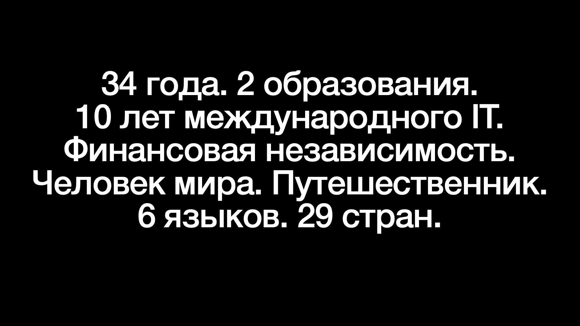 Я начал с презентации себя, это оказалось не так просто, как я думал, пожалуй, именно на эту часть у меня ушло больше всего времени. Задача осложнялась тем, что у меня попросили портфолио, но уже 7 лет как не программист (ну не считая домашних проектов для себя), так что портфолио у меня как такого нет. Зато есть 2 образования, CV за 10 лет работы, много путешествий и танго. Я решил, что это и будет моим портфолио, и сделал по одному слайду про каждую сторону себя, кратко, просто чтобы представиться.
