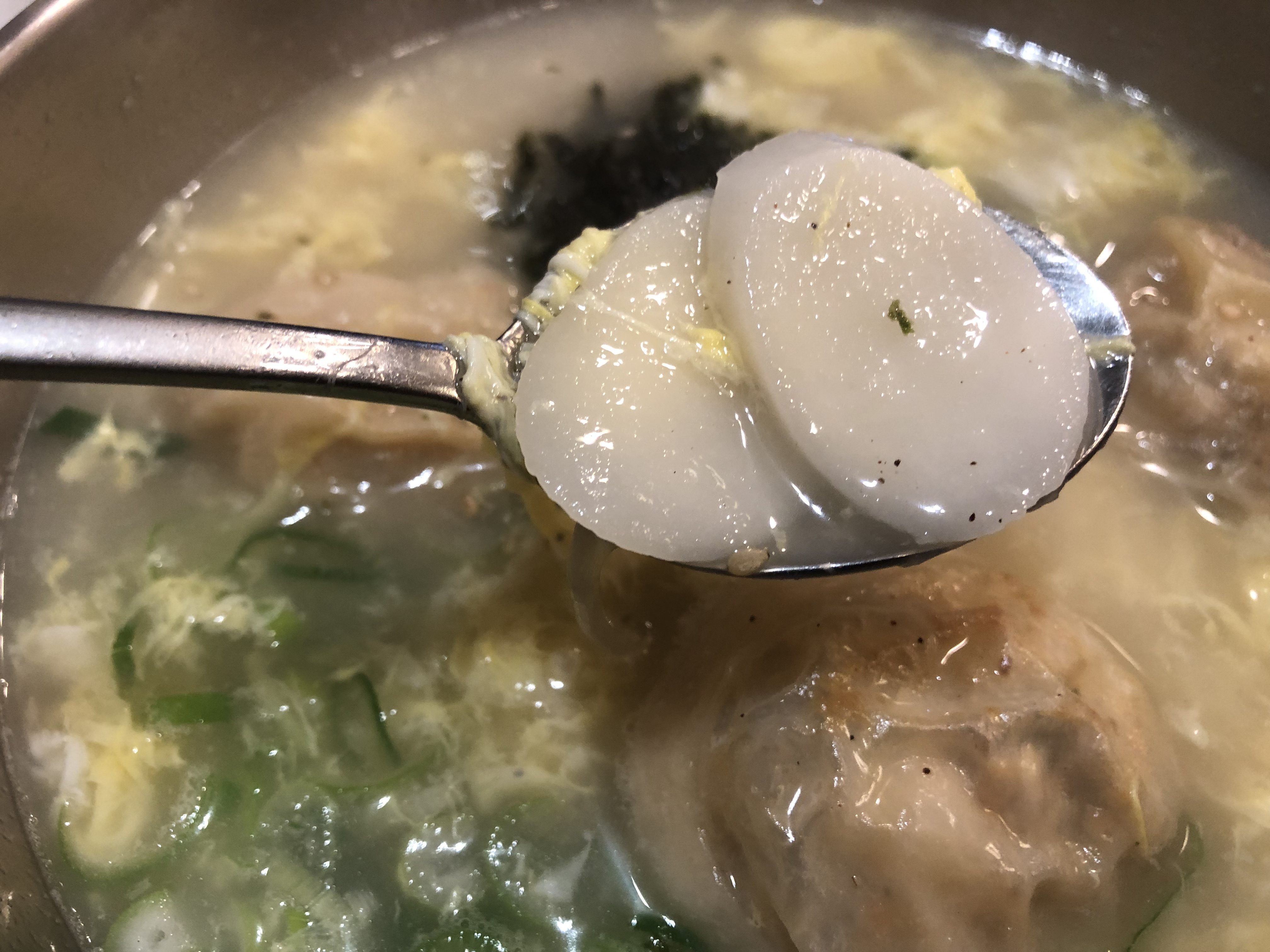 Суп плотный благодаря двум очень важным для корейцев ингредиентам: разбитое яйцо, которое «связывает» бульон распавшись на ошметки, и сушеные водоросли ким (김), которые подсаливают блюдо. Это ощущение сложно передать, так что я записал видео.