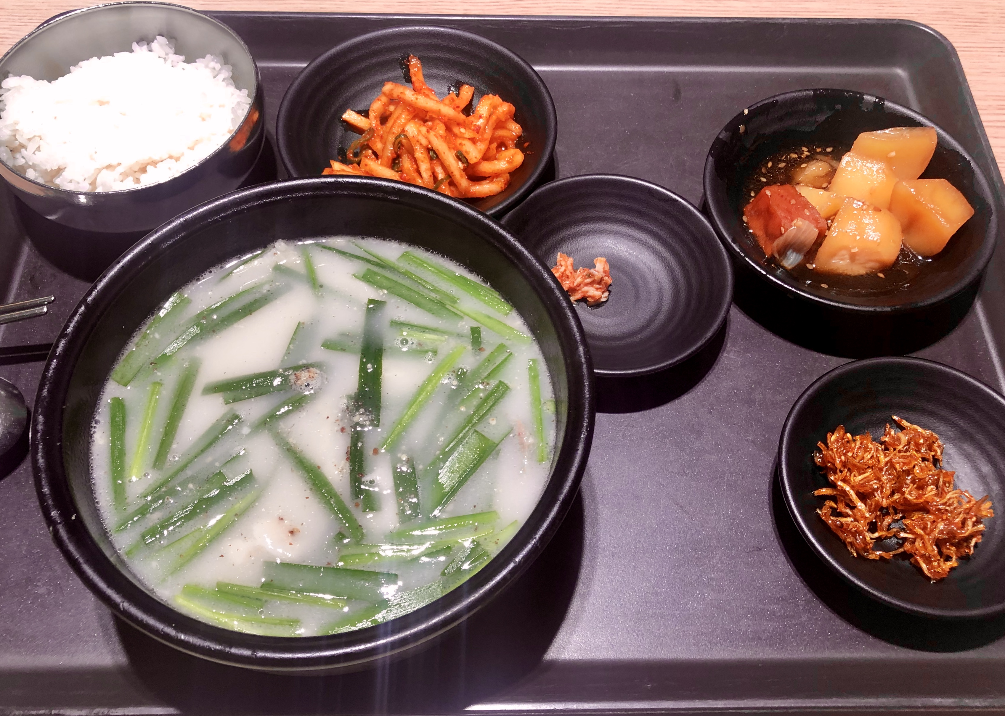 Бульон варят отдельно из костей, что придает белесый цвет. При подаче добавляют свежий зеленый лук и секретный ингредиент - тертый дикий кунжут ДыльКке (들깨)! Он совершенно не похож на обычный. В супе так же плавает набор мяса и органов. После того, как в супе остается только вода, с суп кладут и смешивают рис и съедают =D