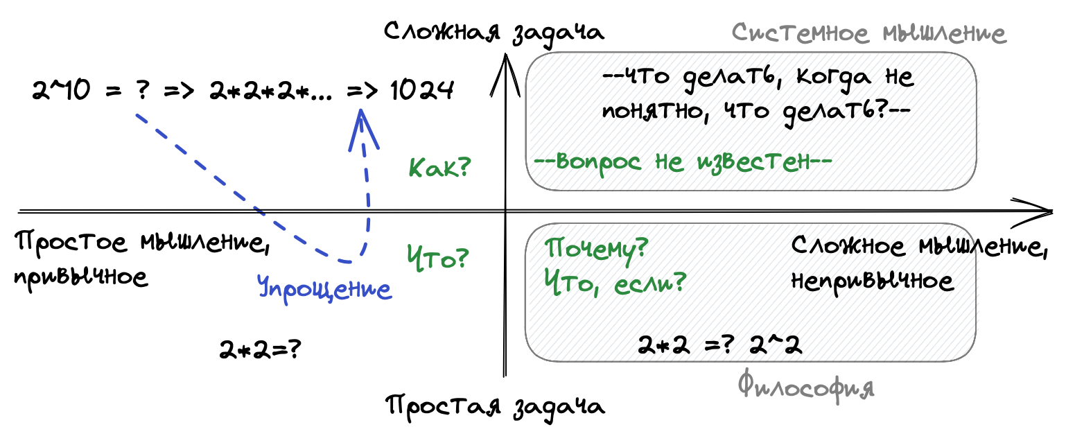 Мы привыкли думать просто о простом, например, доехать от дома до работы на метро просто. Также нам привычно думать просто о сложном - упрощать. Чтобы попасть в другую страну, нужно доехать до аэропорта, лететь на самолете, добраться из аэропорта до города и т.д. Иными словами - совершаем уже связанную серию различных действий, каждое из которых простое. Когда сложность превышает наши возможности, мы обращаемся к более сложному мышлению. Например, для полета в космос необходимо рассчитать траекторию космического полета, спроектировать корабль, подготовить команду космонавтов и пр. Все эти задачи решаются уже набором достаточно сложных дисциплин, которым надо учиться не один год, поскольку они крайне сложны, нетривиальны, непривычны.